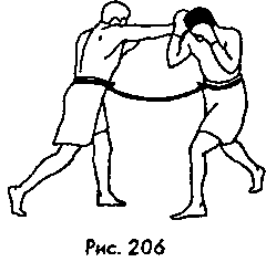 Это вариант боя с использованием рук, когда бойцы соединены веревкой, обвязанной вокруг их поясов (рис. 206), и лишены возможности отступать. Это – «насильственное» принуждение к ведению боя на средней дистанции. Разумеется, удары при этом не должны наноситься в полную силу.
