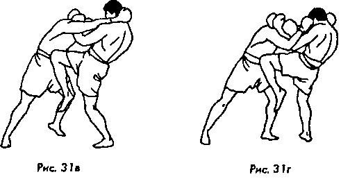Попробуйте выполнить удар. Для этого оттяните назад (как можно дальше) носок правой ноги; затем отклоняя корпус назад и притянув голову соперника к своему правому плечу, коснитесь коленом живота партнера, стремясь попасть в солнечное сплетение. После касания удар должен быть продолжен – движением таза вы должны стремиться пробить соперника до самого позвоночника (рис. 31, в).