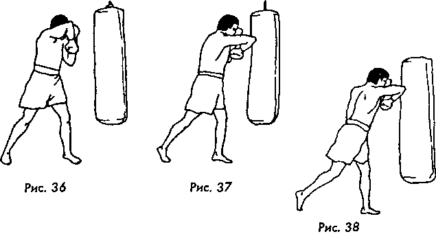 Перенеся вес тела на переднюю (левую) ногу опустите левую руку, сжатую в кулак, к подбородку (она, напряженная в момент удара, должна будет защитить челюсти от возможной атаки). Продолжая сохранять направление взгляда «на уровень груди» или переносицы, сделайте оборот локтем справа – вверх – по диагонали – вниз (рис. 36) и положите локоть ударной поверхностью (рис. 37) на поверхность мешка. Зафиксируйте это состояние.