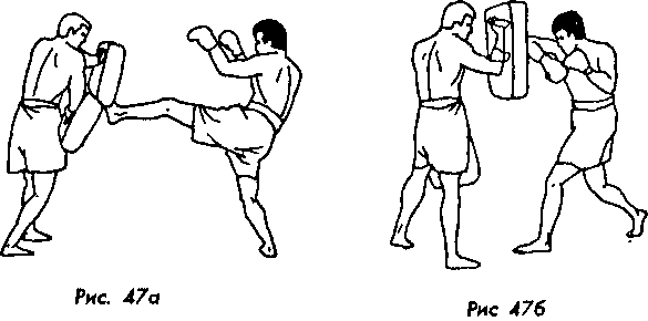 Сначала партнер должен держать надетые на руки лапы в положении, соответствующем изучаемой связке (например, см. рис. 47, а, б, где описано положение лап для связки «стопа – локоть»). При этом боец наносит удары в те моменты, когда ощущает свою готовность к их исполнению.