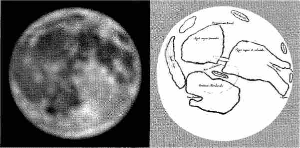 Рис. 5.2. Примерно так видит Луну здоровый невооруженный глаз человека (слева; для точного воспроизведения углового размера деталей рисунок следует рассматривать с расстояния 5 м). Поэтому наблюдатели дотелескопической эпохи смогли составить лишь грубые карты Луны, например, такие, как эта (справа), по – видимому, нарисованная Вильямом Гильбертом, тем самым, который доказал, что Земля – гигантский магнит.