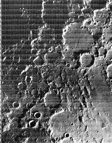 Рис. 5.21. Этот снимок «Рейнджер-7» сделал 31 июля 1964 г., за 17 минут до удара о поверхность Луны. Слева – Море Облаков; справа – кратеры Птолемей, Альфонс и Азахель (сверху вниз). Протяженность кадра по высоте 360 км. Это фото стало первым снимком Луны, полученным американскими космическими аппаратами.