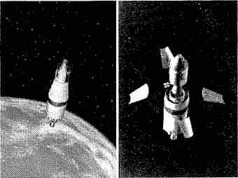 Рис. 6.13. Последняя ступень ракеты «Сатурн-5» с кораблем «Аполлон». Слева: в верхней части виден командно – служебный модуль, а лунный модуль скрыт корпусом ракеты. Справа: створки переходника отстрелились, освободив CSM и обнажив LM.