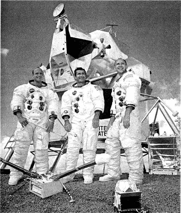 Рис. 6.51. Экипаж «Аполлона-12»: Чарльз Конрад, Ричард Гордон, Алан Бин (слева направо). На переднем плане приборы, предназначенные для экспериментов на Луне: магнитометр (слева) и спектрометр солнечного ветра.