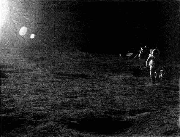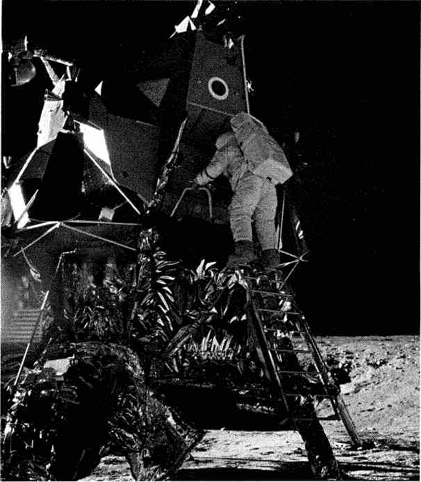 Рис. 6.53. «Аполлон-12» сел вблизи опасного склона. Чарльз Конрад уже на грунте, спускается Алан Бин.