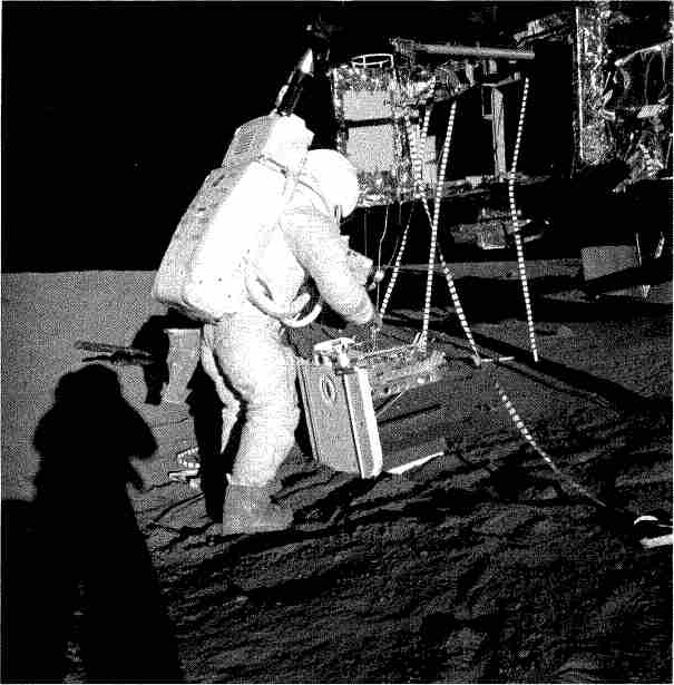ALSEP, сгруппированный в два блока, надели на специальный гриф, как у штанги, и понесли на северо – запад. Нес Бин, а Конрад фотографировал. Нести оказалось неожиданно неудобно (не как на тренировке): при ⅙ gон закручивался по оси «штанги» и выворачивал руки. К тому же ноги тонули в пыли глубиной 10–12 см, которая катилась валиком перед ботинками и поднималась облаком до колен. Через 8 минут похода приглянулась неплохая площадка в 100 м от LM. Расставили (не без проблем) сейсмометр, магнитометр, детектор ионов, ионизационныи манометр, спектрометр частиц солнечной плазмы. Соединили их со SNAP, сориентировали антенну телеметрической системы, включили, получили с Земли информацию – работает! На установку ушел час.