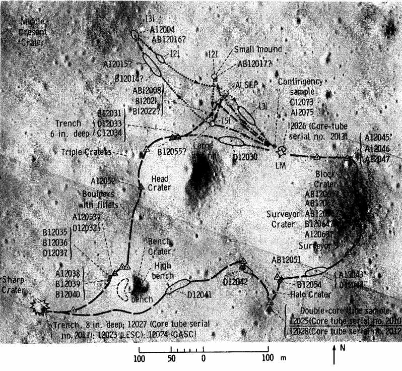 А делали следующее. Конрад побежал на северо-запад проверить ALSEP, а Бин с геологическим планшетом направился к 80–метровому кратеру в 90 м на запад от LM. Встретились через 5 минут на северной бровке, начали огибать его по краю. Остановились для выбора образцов, столкнули внутрь кратера камень. Вместе с камнем чуть не отправился туда же и Бин. Только предупреждающий окрик Конрада избавил его от этого приключения. А камушек катился, медленно и странно разгоняясь, словно от какого‑то внутреннего усилия (малая сила тяжести!). С наиболее высокого места вала сняли панораму. Удаление от LM около 220 м; «Неустрашимый» опустился за горизонт уже «по пояс».