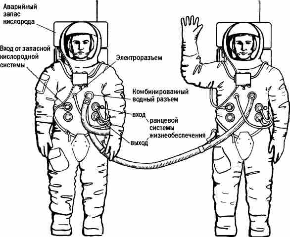 Рис. 6.76. С помощью дополнительного шланга астронавты могли превратиться в «сиамских близнецов», объединив системы охлаждения своих скафандров. На рисунке в аварийной ситуации изображен человек справа.