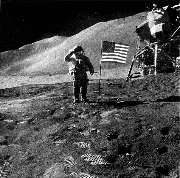 Рис. 6.80. Дэйвид Скотт салютует национальному флагу на фоне горы Хэд– ли – Дельта. Высота горы около 4 км, а до ее основания от места посадки – около 5 км.