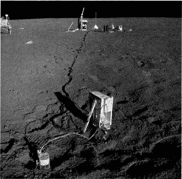 Расставили приборы: блок телеметрии, детектор ионов, ионизационный манометр, детектор заряженных частиц, пассивный сейсмометр, пусковое устройство для гранат. LR3 отнесли еще на 50 м к западу. Отойдя от приборов на юг на 100 м, выполнили эксперимент с ударником и геофонами.