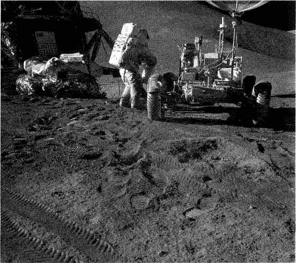 Джим полез на лестницу, чтобы заглянуть в секцию, и в этот момент ровер резко выдвинулся на ¾· От неожиданного толчка Ирвин полетел с лестницы кувырком. Ровер вывалился, словно пьяный, и это обеспокоило командира не меньше, чем падение Ирвина. Джим уже стоял, веселый и слегка измазанный, а ровер висел на расколотом шарнире с вылетевшими узловыми шплинтами и расфиксированным передним мостом. С помощью консультаций из ЦУПа удалось отцепить его от связей с LM и скрепить узлы.