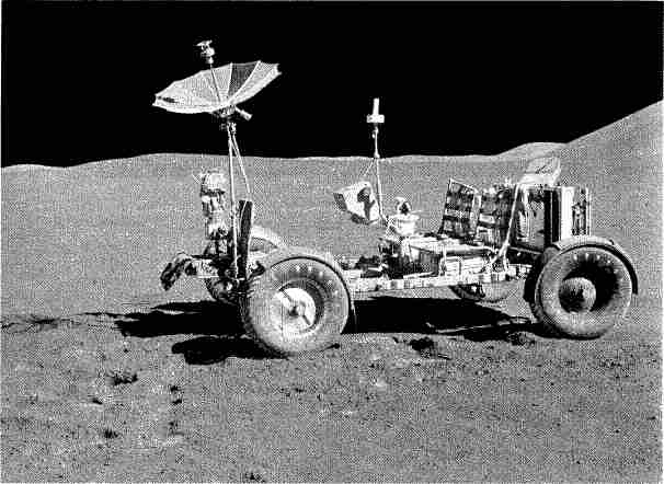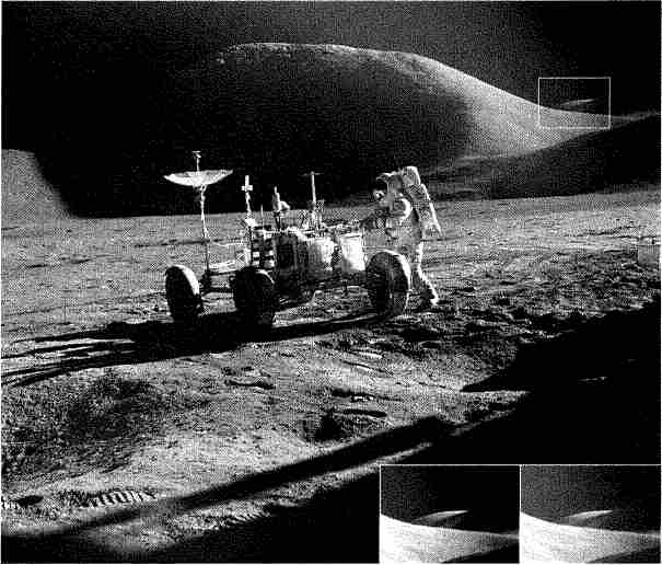 Рис. 6.102. Одна из самых популярных фотографий, доставленных экспедициями «Аполлон». На ней Ираин и ровер на фоне горы Хэдли. Но уфологи «увидели» здесь еще и ракетную базу пришельцев – в правом верхнем углу. Действительно, на газетных высококонтрастных отпечатках видно нечто похожее на нос ракеты или край летающей тарелки. Однако на мягких отпечатках отлично видно, что это просто игра света и тени на склонах холмов.
