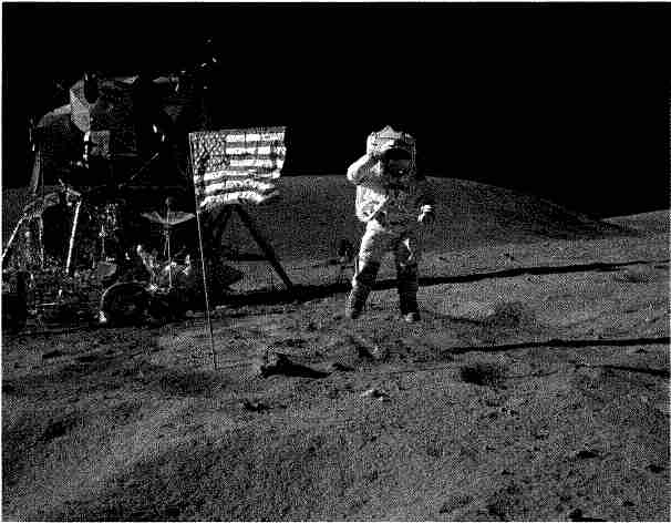 Рис. 6.110. Джон Янг, имевший в скафандре массу 182 кг, мог совершить такой прыжок только на Луне. Обратите внимание: за ним, в тени лунного модуля, на треноге установлен небольшой телескоп – первая (ультрафиолетовая) обсерватория на Луне.
