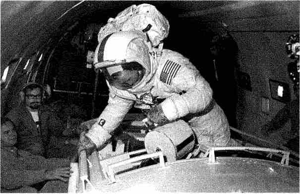 Рис. 6.124. Тренировка в летающей лаборатории (самолет КС-135), создающей кратковременное состояние невесомости при полете по параболическим «горкам». Пилот СМ дублирующего экипажа Стюарт Руса вынимает кассету с пленкой из фотокамеры во внешнем отделении служебного модуля. В полете эта операция проводится на трассе Луна – Земля.