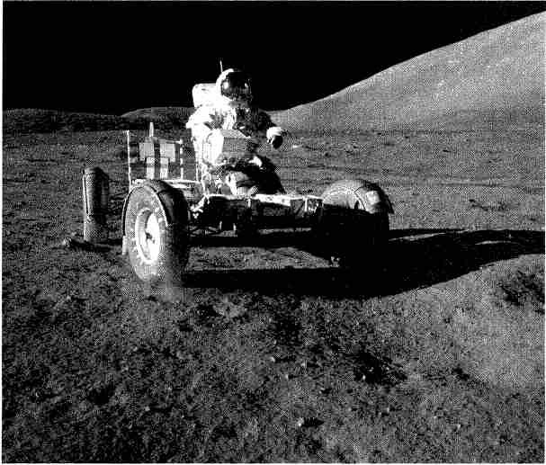 Рис. 6.126. «Лунный гонщик» Юджин Сернан в пробной поездке на не полностью снаряженном ровере. Справа вдали – восточная часть Южного массива.
