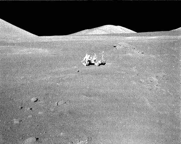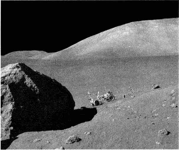 Рис. 6.130. Стоянка № 4. Ровер въехал на вал кратера Шорти (на фото кратер справа). Именно здесь Шмитт впервые обнаружил оранжевый грунт. Слева на горизонте – часть Южного массива; в центре – светлый пик Family Mountain.