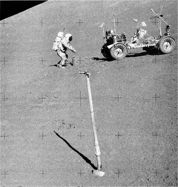 Пора было покидать стоянку, но Сернан и Шмитт заканчивали рыть траншею, и Хьюстон угрюмо не прерывал их. Неожиданно Шмитт вскрыл светлый материал на глубине 15 см. Джек подумал, что если бы они прилунились в этом месте, и это был бы их первый образец, они бы решили, что темная мантия лишь покрывает равнину, но на третий день исследований он уже знал, что это не так. Геологи ЦУПа попросили сделать двойной керн. Но Шмитт сомневался: грунт насыщен камнями, и Сернану будет трудно вбить в него трубу.