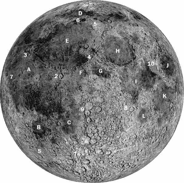Рис. 2.13. Составное изображение лунного диска с обозначениями некоторых образований: А – Океан Бурь, В – Море Влажности, С – Море Облаков, D – Море Холода, Е – Море Дождей, F – Залив Зноя, G – Море Паров, Н – Море Ясности, I – Море Спокойствия, J – Море Кризисов, К – Море Изобилия, L – Море Нектара, S – Криптоморе (кратер Шиккард). 1 – кратер Тихо, 2 – кратер Коперник, 3 – кратер Аристарх, 4 – горы Апеннины, 5 – горы Альпы, 6 – кратер Платон, 7 – образование Рейнер – гамма, 8 – кратеры Теофил, Кирилл и Катарина (сверху вниз), 9 – кратеры Птолемей, Альфонс и Арза– хель (сверху вниз), 10 – кратер Прокл.