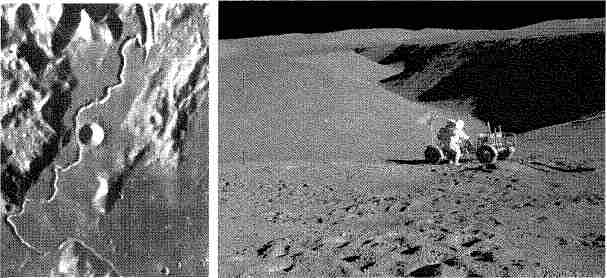 Рис. 2.18. Борозда Хэдли. Рис. 2.19. Астронавт рядом с лунным электромобилем вблизи Борозды Хэдли.