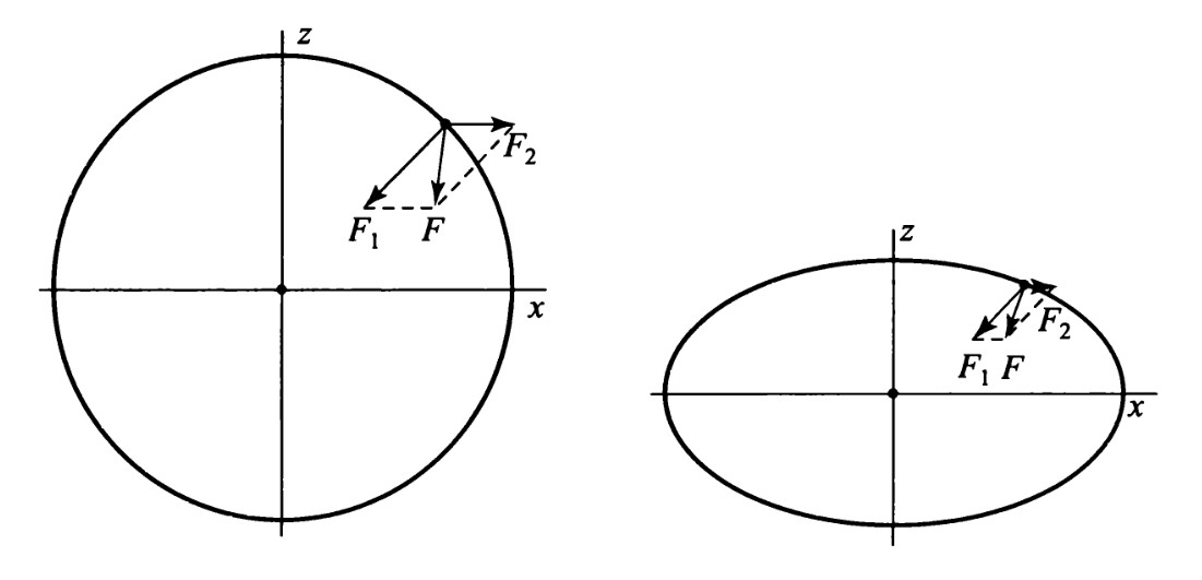 Рис.6. Силы, действующие на поверхностную частицу тела во вращающейся вокруг оси z системе отсчета: F1 – сила тяготения, F2 – центробежная сила, F – результирующая сила тяжести. Слева – сечение шара, справа – фигуры равновесия; ГГ – линия математического горизонта.