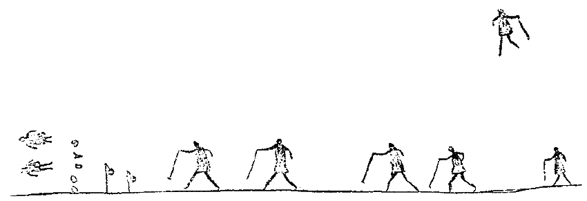 Туземный рисунок (рис. 85) изображает бег взапуски у приморских чукоч, устроенный в связи с «настоящим благодарственным праздником». В состязании принимают участие шесть человек. Двое – «хозяева бегов» – наблюдают за ними. Призами для бегунов служат навешенные на две короткие палки ремень и пучок листового табаку. На земле стоят два жертвенных сосуда и три головы: моржовая, песцовая и заячья.
