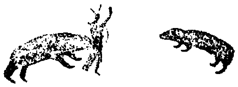 В моем собрании чукотских рисунков есть несколько изображений «порчи». На одном из них изображена верхняя половина туловища тюленя, посланная злым шаманом напугать морского охотника. На другом – два медведя схватили женщину, «обреченную гневу», и мучают ее, перебрасывая, как мяч, из стороны в сторону (рис. 97).