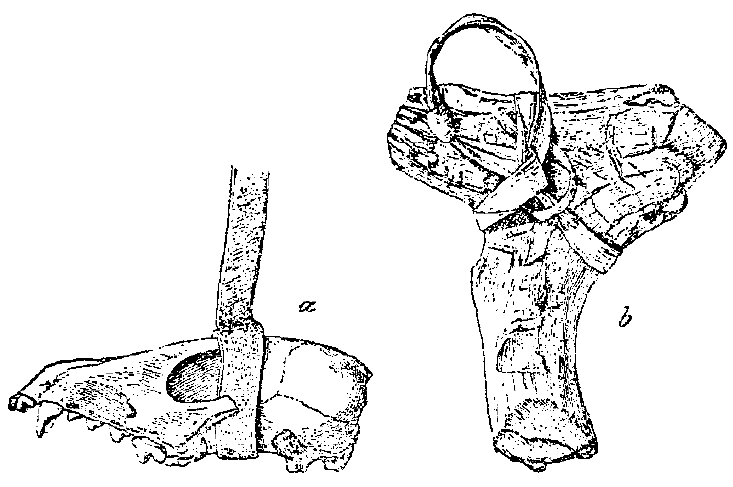 Наиболее распространенным способом гадания является гадание при помощи подвешивания различных предметов. Чукчи и эскимосы употребляют для этого так называемый «гадальный камень» jьt-komk-wukwun (буквально – «качающийся камень»). Для этой цели может служить всякий камень, обвязанный ремешком. Правда, предпочтение отдается камням необыкновенной формы. Для гадания часто употребляются также череп какого-нибудь зверя (рис. 98, а), «деревянный дух»[247]247