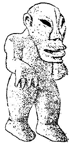 Резная фигурка из кости (рис. 11), полученная от приморских коряков в бухте Корфа, изображает «духа» заразной болезни. Он весьма схож с подобными же изображениями на рисунках чукоч. У него большая пасть, полная зубов, его руки вооружены когтями, один из которых сломан.