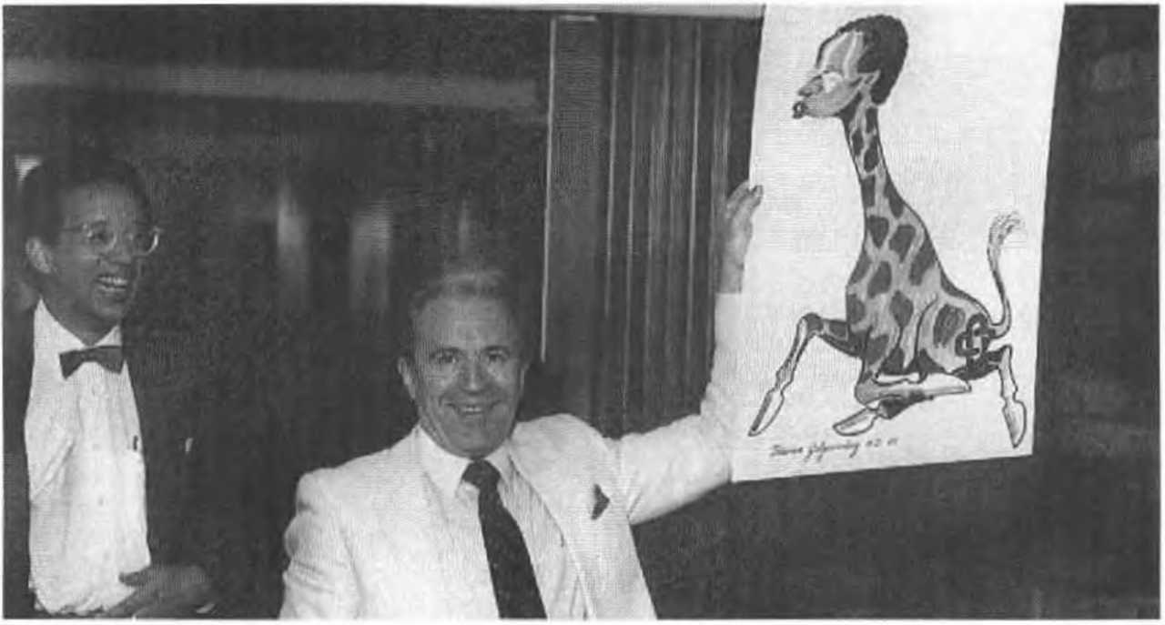 На выпускном банкете резидентов в 1985 году я показываю свой дружеский шарж на резидента д-ра Вильямса с Ямайки, которого мы прозвали Жирафом (он стоит рядом). Из моих шаржей составлена целая галерея, которая существует вот уже скоро 20 лет.