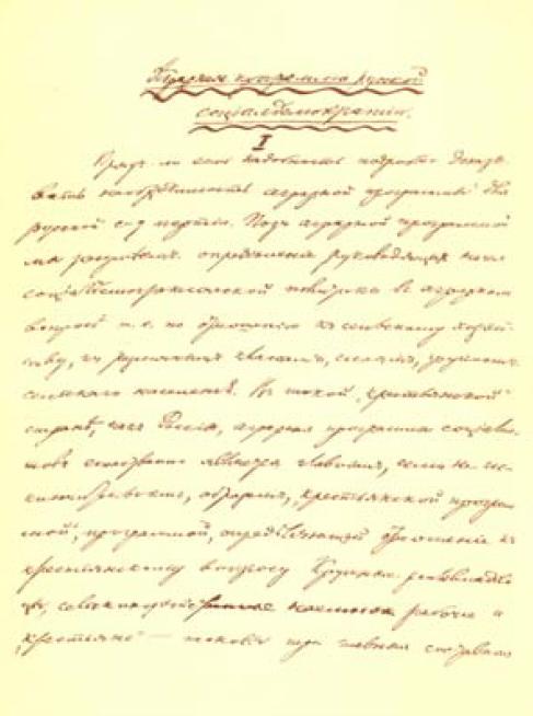 Первая страница рукописи В. И. Ленина «Аграрная программа русской социал-демократии». – 1902 г. (Уменьшено)