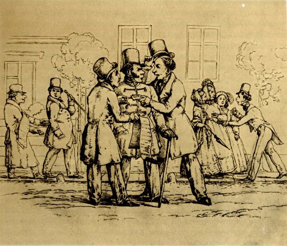 …проводил до Трех рук…– то есть до первой почтовой станции, расположенной в 10 верстах от города. «Здесь обыкновенно прощаются с милыми сердцу особами во время проводов из С.-Петербурга по Московской дороге»,– объясняет путеводитель, современный «Похождениям Виольдамура» (И. Д. Дмитриев). Путеводитель от Москвы до С.-Петербурга и обратно… Изд. 2-е. М., 1847, с. 606). Здесь стояли на скрещении дорог три столба с надписями и изображениями рук, указывающих направление. Благодаря им место и получило свое название (с появлением еще одной дороги стало называться «Четыре руки»).