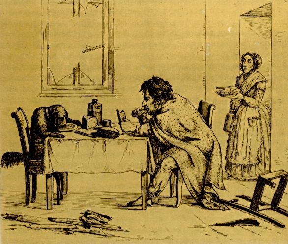 Утром Виольдамур проснулся от стуку у дверей кабинета; он вскочил и стал оглядываться, чтобы опознаться, где и что он – перед ним диван, на котором постлана постель, под окном стол, пара старых стульев, целая стена уставлена книгами на полках, над диваном мужской портрет, изображавший, как казалось, покойного хозяина,– и все это покрыто густою пылью и паутиной. Между тем кто-то нетерпеливо ломится в запертую дверь; Христиан отпирает – входит довольно ощипанный малый и на вопрос: что нужно? отвечает спокойно, проходя в угол к окну: "Да барин трубку спрашивает, гневается, что долго не подаешь, а тут вы изволили запереться". Лакей взял трубку и ушел. Вскоре пришел другой и подал Христиану чашку чаю.