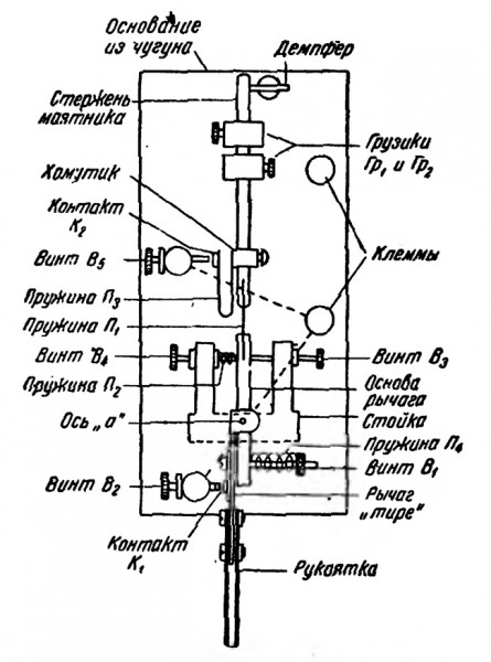 Рычаг имеет две системы контактов. Контакт K1 служит для передачи «тире», а контакт К2, укрепленный на пружине П3, служит для передачи «точек». Пружина П3 хомутиком закреплена на стержне маятника.