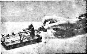 Для передачи «тире» рукоятку ключа надо нажать влево, до замыкания контакта K1 с винтом В2. Если же мы нажмем на рукоятку вправо, то в действие придет маятниковая система и контакт К2 будет периодически замыкаться с винтом В5, вследствие чего будет передана серия точек. Частота колебания маятниковой системы для передачи точек зависит от положения грузиков Гp1 и Гр2, расположенных на стержне маятника.