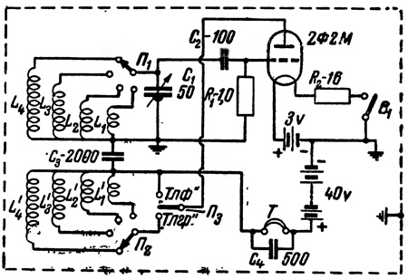 На рис. 3 приведена схема простого монитора, питающегося от батареи и работающего на лампе 2Ф2М. Схема настолько проста, что не требует особых пояснений. Переключатель Пз служит для перехода с контроля передачи незатухающими колебаниями на контроль телефонной передачи, а выключатель B1 рвет цепь накала. Можно питать монитор и от сети, но тогда надо ставить хороший фильтр в сетевые провода, чтобы ослабить связь передатчика с монитором.