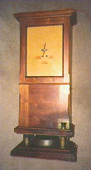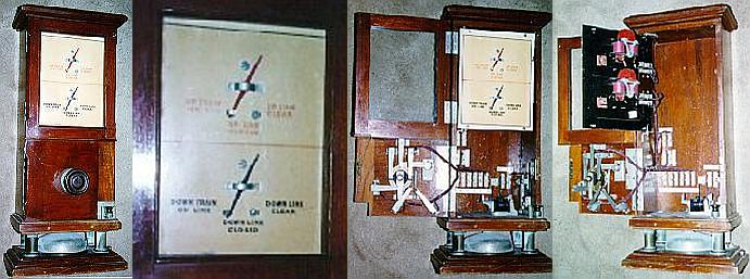 Сегдня вспомнил, что начало то я пропустил. Фактически обзор начат с техники предназначенной для телеграфирования по Морзе. И только вкратце был упомянут самый первый телеграфный аппарт изобретённый Шиллингом в котором коды букв передавались с клавиатуры по семи парам проводов, а приём осуществлялся тоже семью гальванометрами с магнитными стрелками. Естественно это была весьма неудобная и громоздкая система и особого распространения она не получила. Известная линия связи была построена в 1832 году между Зимним дворцом и зданием министерства путей сообщения. Самыми первыми телеграфные линии внедрялись там где они в первую очередь были остро нужны – на железных дорогах. Первыми аппаратами были скорее не телеграфные а аппараты сигнализации, для передачи сообщений о занятости пути. Как к примеру этот. Где приемным устройством был гальванометр со стрелкой с тремя отметками. Средняя – нет тока, крайние положителный или отрицательный. Означающие: «Путь закрыт», «Поезд на линии», «Линия свободна».