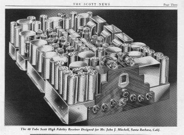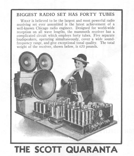 «E. H. Scott 48-tube QUARANTA» Этот шедевр, вершина достижений в построении лампового радио был самым сложным и самым большим ансамблем радио когда-либо спроектированным и построенным. Он был изготовлен Скотт радио Laboratories в 1930 году. И всего лишь одним такой комплекс был продан клиенту во Францию в 1936 г. Блок тюнера был приобретен г-ном Жак Дюбуа и является сейчас краеугольным камнем этой профессионально восстановленного комплекса «Quaranta», которым он занимался с 1987 до 2000 года. Описание этого проекта содержится в его собрании заметок под названием«Service Notes – Scott Full Range Quaranta High Fidelity – 48 Tubes – Superheterodyne Receiver», here is Mr. Dubois' account of this project.