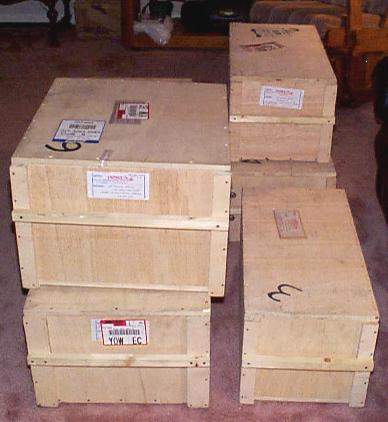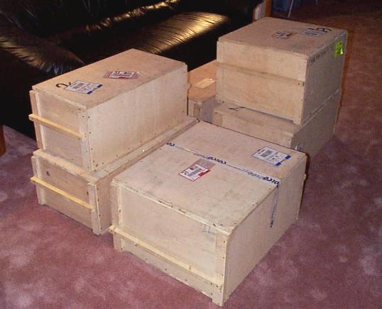 Quaranta "ансамбль" прибыл в Канаду в августе этого года. Все было профессионально упаковано Жак Дюбуа и его многочисленными находчивыми друзьями. Я включаю фотографии ящиков как они прибыли, чтобы можно было видеть, как они грузят если есть покупатель. Кстати, груз было сделано Эмери Worldwide и их люди здесь в Оттаве признались, что никогда не видел такую фантастическую работу по упаковке. Все ящики деревянные, содержащий 14 мм толщиной панели из массива дерева с особыми ручками. Содержимое были заполнены пеной. Шесть ящиков различных размеров и веса. Топы были все закреплены на месте с латунными винтами.