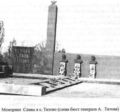 В 1990 г. в с. Титово был открыт мемориал славы. На мемориале были установлены скульптурные портреты генерала А. С. Титова и двух Героев Советского Союза – местных уроженцев, павших во время войны.