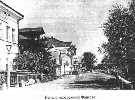 Квартал набережной Фадеева от ул. Свободы до Черниговского переулка застроен деревянными домами; за ними прямо над огородами возвышается пятиэтажка под № 26, построенная в 1970 г., с двумя продовольственными магазинами.