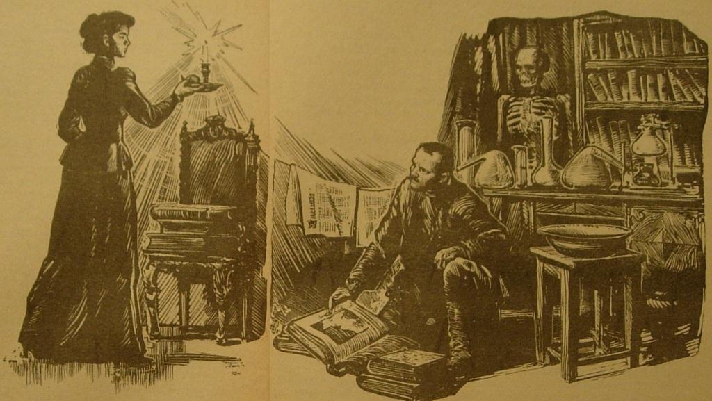 Страх, навеянный Беклином, овладевает Стоклицкой, и она боязливо поглядывает в темный угол, где стоит скелет.