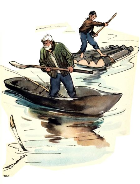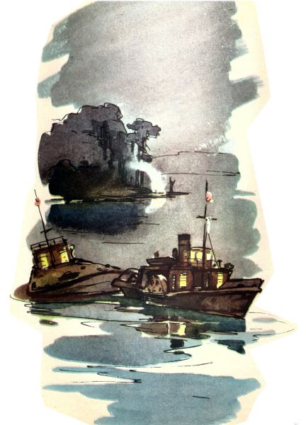 Не успел мальчик как следует согреться у новой теплины, как его разбудили громкие голоса на реке. На черной воде плясали отражения огней. Громко стучал дизель буксира. Раздавались хлюпающие удары троса.