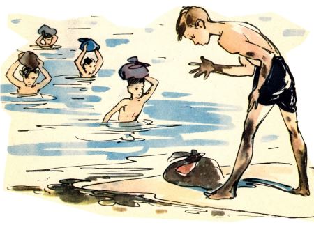 Разведчики пионерского лагеря «Лесная республика» смело двинулись через реку. Всем хорошо был известен брод, но ребята переплыли реку на неглубоком месте, держа в вытянутых руках связанные вещи.