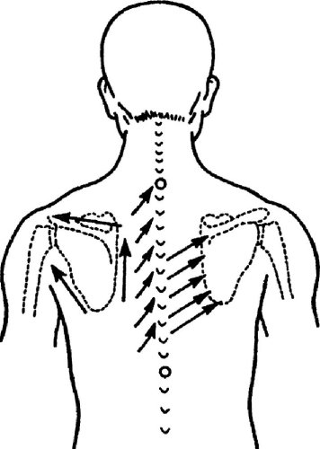 Рис. 54. Направление массажных движений при соединительнотканном массаже спины и лопатки