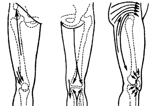Рис 57. Направление массажных движении при соединительнотканном массаже бедра