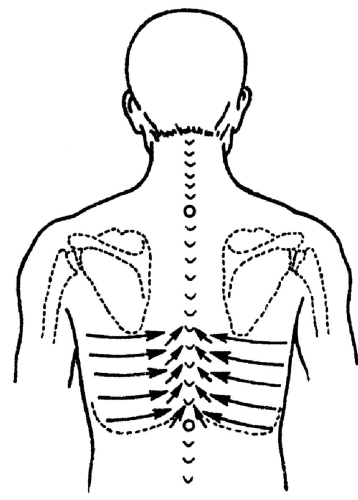 ✓ длинное движение от латерального края крестцово-остистой мышцы до остистого отростка вышележащего позвонка; начинают от уровня XII ребра и заканчивают на уровне нижнего угла лопатки (короткое);