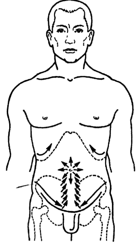 Рис. 59. Направление массажных движений при соединительнотканном массаже живота