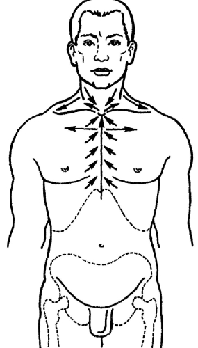 ✓ заключительное движение (длинное) можно делать обеими руками одновременно по грудино-реберным сочленениям до яремной вырезки; можно продлить это движение до акромиальных концов ключицы, проводя пальцами под ключицами (рис. 60).