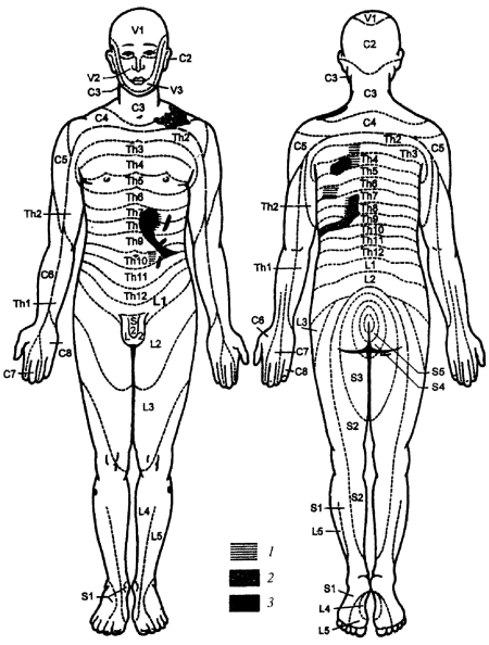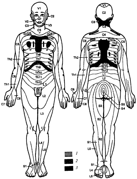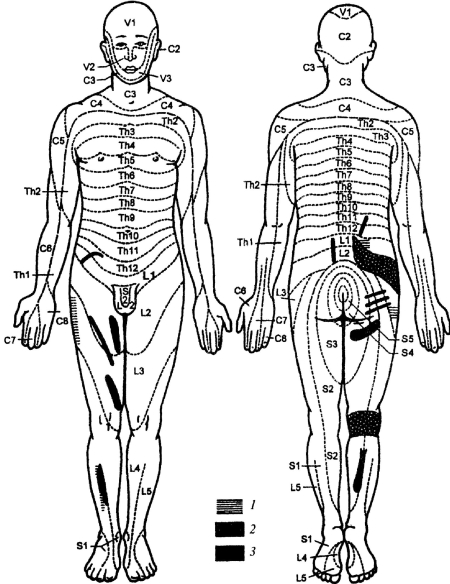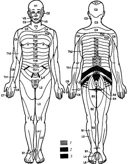 Рис 63 Сегментарный массаж при крестцовых болях, рефлекторные изменения 1 – на коже, 2 – в соединительной ткани, 3 – в мышцах