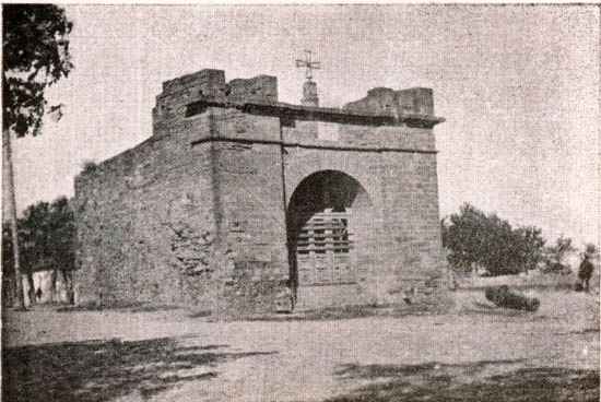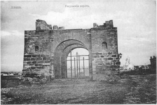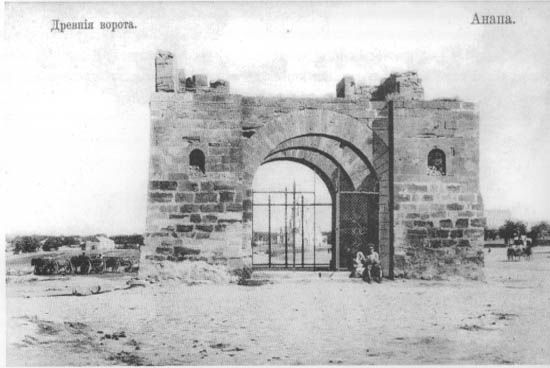 Рис. 34. Более ранний снимок «Русских ворот» (до 1913 г.). На открытке они названы генуэзскими ошибочно. Ее издатель, зная об укрепленном генуэзском поселении в Анапе, очевидно, считал, что турки заняли и использовали уже построенную крепость генуэзцев. Справа от ворот хорошо видна Свято-Оссиевская церковь